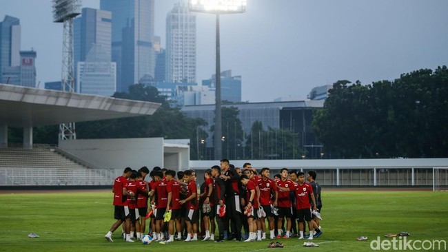 Jakarta - Latihan perdana Timnas U23 digelar di Lapangan Madya, Jakarta. Indra Sjafri memimpin langsung persiapan menuju SEA Games 2025 di Thailand.