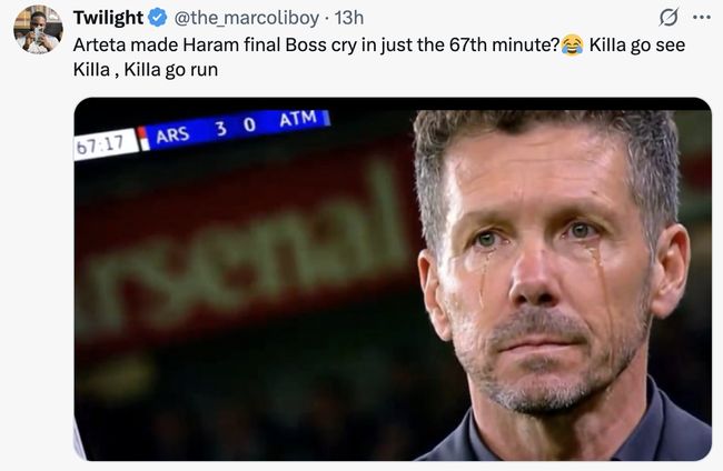 Arsenal mengalahkan Atletico Madrid 4-0 dalam laga yang dijuluki fans sebagai 'derby haramball'. Diego Simeone dibuat menangis oleh Mikel Arteta dalam meme ini. (Foto: Twitter)