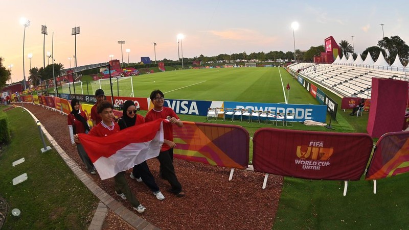 Suporter Timnas Indonesia U-17 berjalan di area lapangan 7 Aspire Zone sebelum laga Piala Dunia U-17 di Doha, Qatar, Selasa (4/11/2025). ANTARA FOTO/Bayu Pratama S