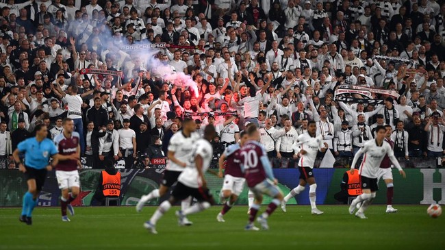 Melansir AP, terjadi insiden pemukulan di pertandingan leg pertama semifinal Liga Europa, yang mempertemukan West Ham United vs Eintracht Frankfurt di London Stadium, Jumat (29/4/2022) dini hari WIB.