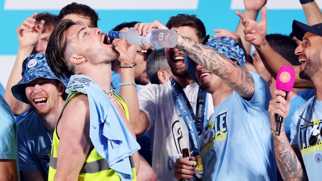 Jack Grealish merayakan gelar treble Manchester City dengan nyeleneh. Bintang asal Inggris itu tidak berhenti minum alkohol hingga mabuk. Duh!