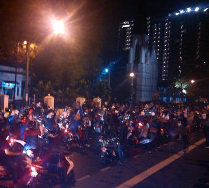 Pantauan di Jalan Merdeka, Kota Bandung, ribuan sepeda motor bobotoh menyesaki ruas jalan. Mereka kebanyakan usai nobar di Balaikota Bandung. "Kita keliling Bandung. Hidup Persib. Juara," teriak bobotoh.