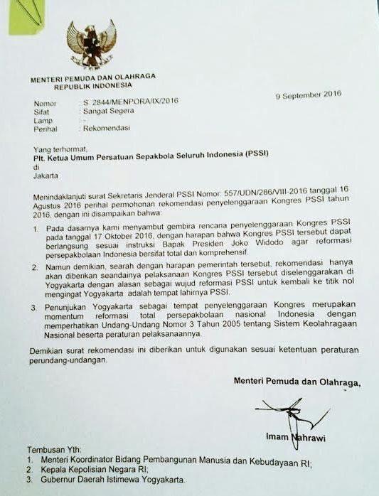 "Iya betul ada surat tersebut, dan itu rekomendasi dari pemerintah karena adanya surat permintaan dari PSSI melalui suratnya," katanya.