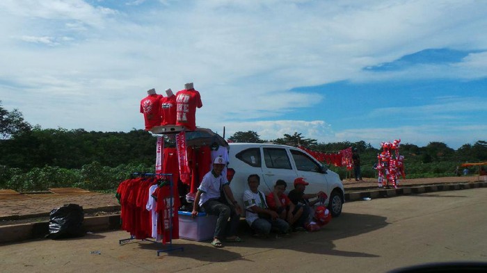 Sekeliling bundaran Stadion Pakansari memang sudah ramai dengan para penjual pernak-pernik timnas. Selain menggelar dagangan di jalan, ada pula penjual yang menjajakan barang dagangannya menggunakan mobil pribadi.