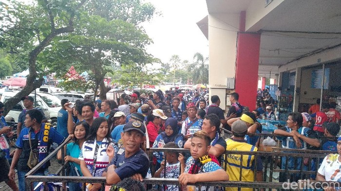 Pantauan detikSport, ratusan suporter rela mengantre untuk bisa masuk melalui pemeriksaan. Sementara, suporter lainnya lebih memilih untuk bersantai terlebih dahulu di luar area stadion.