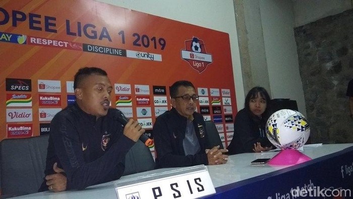 Pelatih PSIS Semarang Jafri Sastra (tengah) memberi keterangan pers. (Foto: Eko Susanto/detikSport)