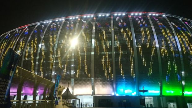 Kemilau Jakarta International Stadium sudah terlihat dari kejauhan di jalan raya. Perisai bagian luar JIS (facade) menggunakan pencahayaan LED sehingga bisa menyala warna-warni.