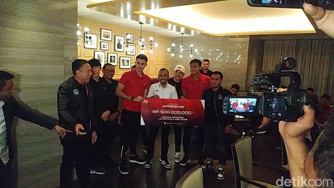 "Ini ada bonus Rp 1,4 miliar, ditambah Rp 500 juta dari Juragan99. Jadi totalnya Rp 1,9 miliar," kata Ketua Umum PSSI Mochamad Iriawan saat memberikan pidato di depan para pemain Timnas Indonesia.