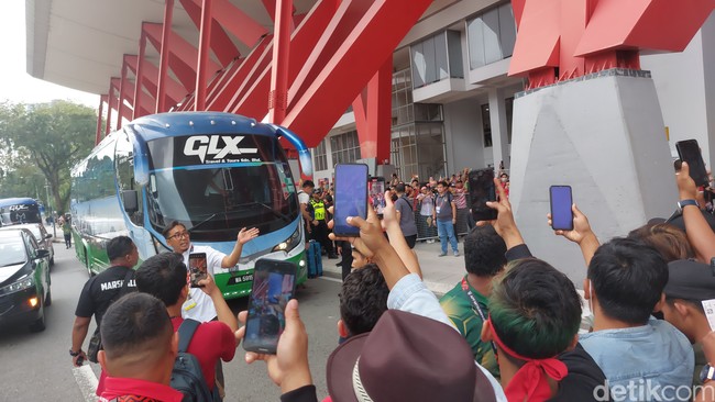 Timnas Indonesia tiba di stadion Kuala Lumpur FA untuk lanjutan Piala AFF 2022. Ratusan suporter langsung menyerbu mendekat ke bus rombongan pemain.