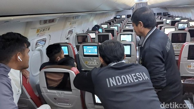 Direktur Teknik Timnas Indonesia, Indra Sjafri, juga beranjak dari tempat duduknya di kelas bisnis. Dia jalan-jalan ke tiap kursi untuk melihat para pemain.