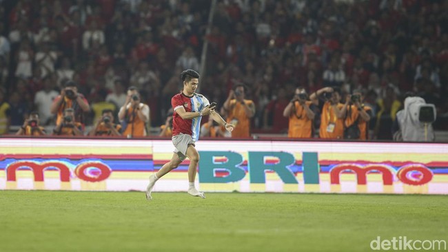 Seorang pria yang memakai belang-belang, yakni sebelah warna biru langit Argentina dan sebelah warna merah Timnas Indonesia, berlari ke lapangan dari arah zona 4.