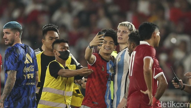 Fans yang menyusup ke lapangan usai laga Indonesia vs Argentina pasti senang. Sebab, misinya berswafoto dengan Alejandro Garnacho terwujud.