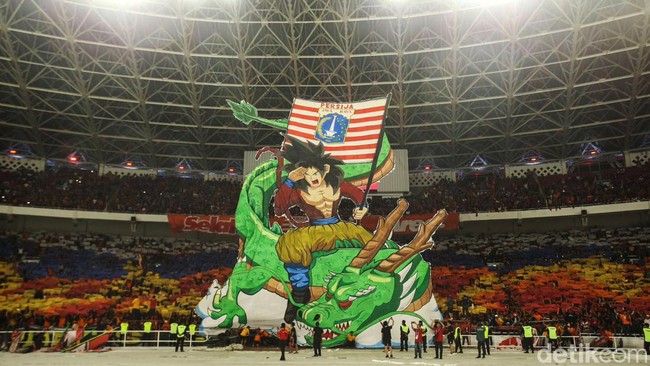Suporter yang seluruhnya merupakan The Jakmania membentangkan koreografi berupa gambar tokoh anime Son Goku yang menaiki awan kinton di salah satu tribunnya. Di sisi tribun lain juga menampilkan gambar putra Son Goku, Son Gohan berwujud Super Saiyan 4.