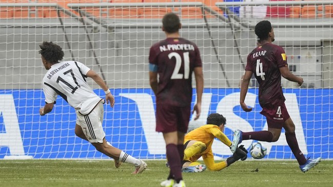 Jerman vs Venezuela tersaji pada Jakarta International Stadium pada laga Grup F Piala Dunia U-17 2023, Sabtu (18/11). Jerman langsung membuka keunggulan ketika laga baru berjalan satu menit.