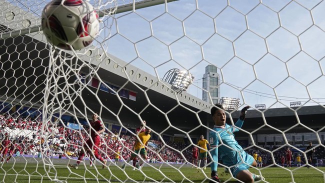 Indonesia kalah 0-4 dari Australia di babak 16 besar Piala Asia 2023. Empat gol bersarang ke gawang Ernando Ari Sutaryadi di Jassim bin Hamad Stadium, Al Rayyan, Qatar, Minggu (28/1/2024).