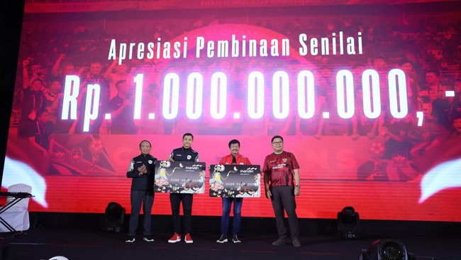 Dalam acara malam apresiasi yang berlangsung meriah di Plaza Mandiri, Jakarta, pada Rabu (31/7) malam, Direktur Utama Bank Mandiri Darmawan Junaidi menyerahkan dana pembinaan senilai Rp 1 miliar secara simbolis kepada Kapten Timnas U-19 Dony Tri Pamungkas dan Pelatih Indra Sjafri.