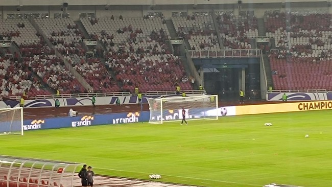 Beberapa suporter yang sudah masuk ke dalam stadion menyambut Shin Tae-yong saat masuk ke lapangan. Pelatih asal Korea Selatan itu pun menyambutnya dengan gembira.