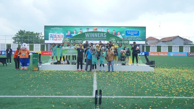 Coach Mochi hadir langsung dalam perhelatan MilkLife Soccer Challenge All-Stars digelar di Supersoccer Arena, Kudus, Minggu (26/1/2025). Laga pamungkas mempertemukan siswi dari Kudus dan Solo.