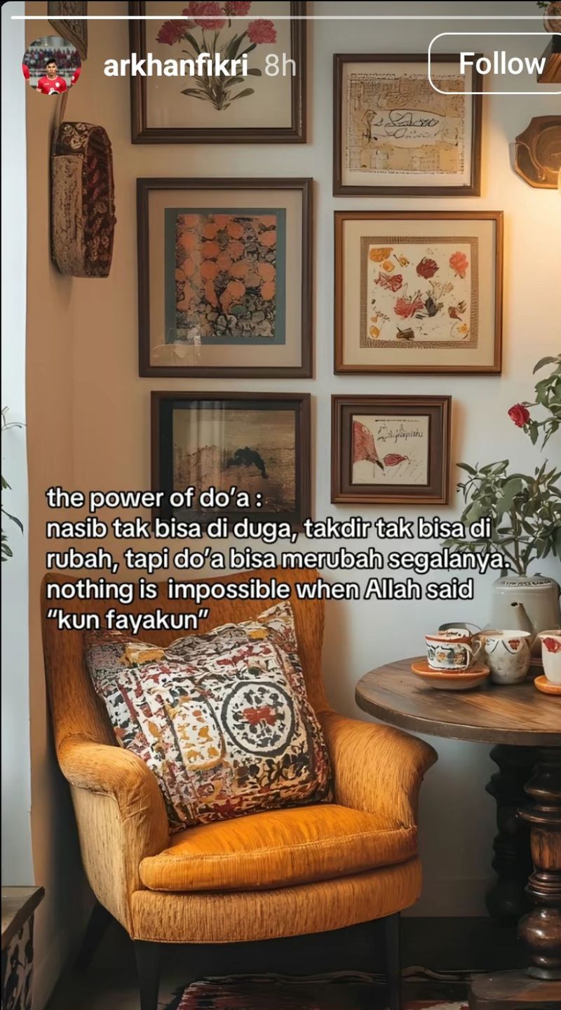 Beberapa jam sebelum laga, Arkan Fikri mengunggah Instagram story yang religius.