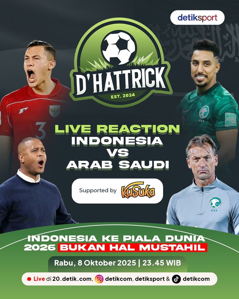 Indonesia vs Arab Saudi akan berlaga dini hari nanti. Mari ramaikan d'Hattrick Live Reaction di detikcom bareng Kusuka!