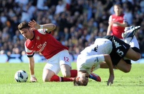 Giroud dikartu merah di menit-menit akhir dalam laga kontra Fulham, Sabtu (20/4/2013). Sebabnya, striker asal Prancis itu melancarkan tekel dua kaki terhadap Stanislav Manolev.