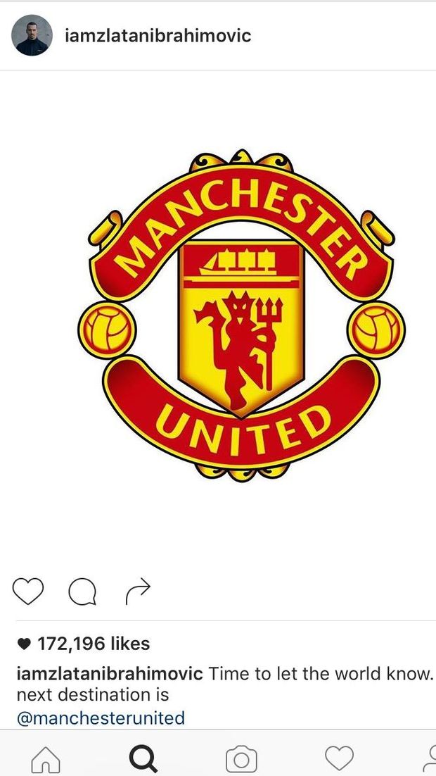 Pernyataan itu diumumkan Zlatan lewat instagram IAmZlatan yang terverifikasi. Zlatan mengunggah logo MU pada Kamis (30/6/2016) malam WIB dengan keterangan: "Saatnya memberi tahu dunia sekarang. Destinasi saya selanjutnya adalah @manchesterunited #iamcoming".