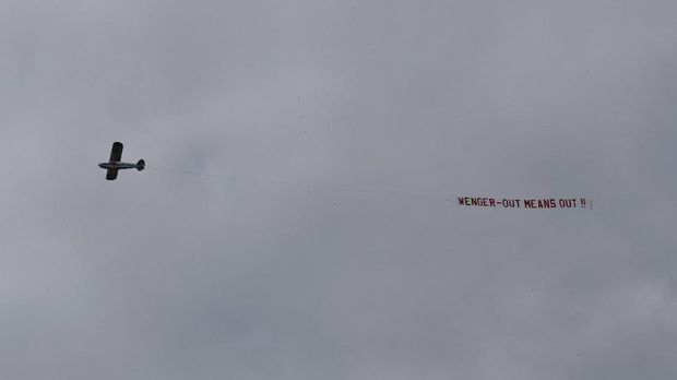 Salah satu spanduk tersebut membentang di angkasa dengan terikat di belakang pesawat terbang yang melintas di atas Bet365 Stadium, Sabtu (13/5/2017), ketika Arsenal menang 4-1 atas tuan rumah Stoke City.