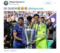 Courtois meniru postingan Pique itu untuk mengomentari nasib Diego Costa. Lewat Twitter, kiper Chelsea itu menulis 'SE QUEDA @diegocosta' sambil mengunggah foto sedang bersama-sama memegang trofi Premier League musim lalu.