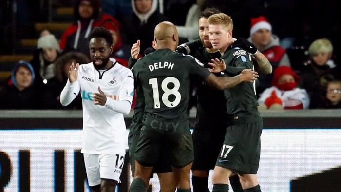 Swansea merespons dengan serangan cepat di menit ke-10. Jordan Ayew mencoba melepaskan sepakan dari luar kotak penalti, tapi masih mudah diantisipasi Ederson Moraes.