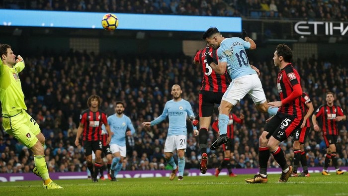 Fernandinho yang menguasai bola mengirimkan umpan matang kepada Aguero yang berdiri bebas di kotak penalti. Sambil menjatuhkan diri, Aguero menyundul bola untuk merobek gawang Bournemouth. City memimpin 1-0.