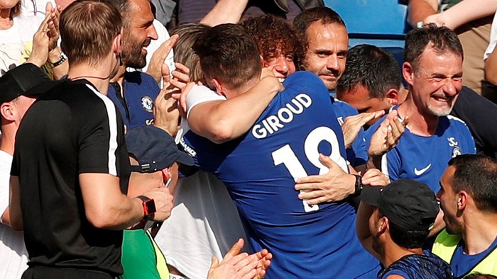 Setelah membobol gawang Loris Karius di babak pertama, Giroud berlari menuju pinggir lapangan. Mantan pemain Arsenal itu naik ke tribune dan memeluk Luiz, yang tidak dimainkan.