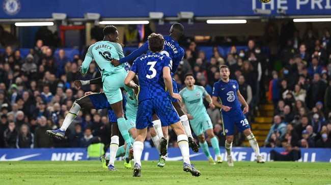 Cucurella mengangkat bola ke kotak penalti. Welbeck, yang dikawal dua bek Chelsea, masih mampu menyundul bola untuk mengecoh Edouard Mendy.