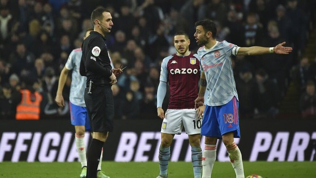Usai laga Aston Villa vs Manchester United, Bruno Fernandes rupanya menghampiri wasit dan dengan kesal menanyakan sesuatu yang ia yakini sebagai akal-akalan tim lawan.