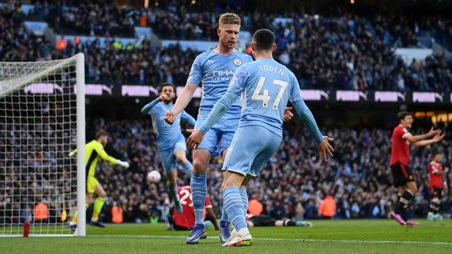 Laga Man City vs MU dilangsungkan di Stadion Etihad pada Minggu (6/3/2022) malam WIB. Dua gol the Citizens dicetak Kevin de Bruyne sedangkan gol balasan Manchester United terlahir melalui Jadon Sancho.