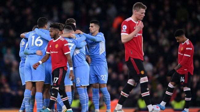 MU tumbang 1-4 dari Man City di Etihad Stadium pada laga lanjutan Liga Inggris, Minggu (6/3/2022) malam WIB. Empat gol The Citizens di Derby Manchester lahir dari Kevin De Bruyne (menit ke-5 dan 28) dan Riyad Mahrez (68' dan 90'). Sementara, Setan Merah hanya mampu membalas melalui Jadon Sancho (22').
