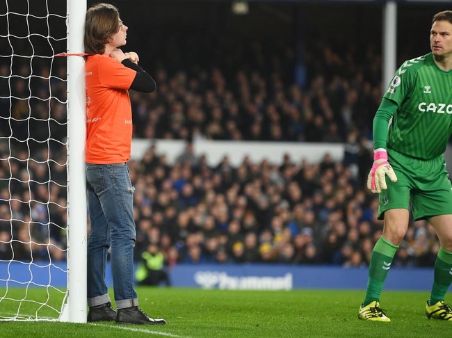 Sebuah momen tak biasa terlihat di laga Everton vs Newcastle United. Ada pria berunjuk rasa, masuk ke lapangan, dan mengikat lehernya ke tiang gawang!