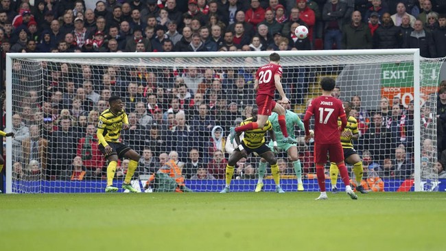 Diogo Jota membuka keunggulan Liverpool di babak pertama pada laga di Anfield, Sabtu (2/4/2022.) Namun, meski tampil superior the Reds butuh waktu sampai menit-menit akhir untuk menambah golnya, itupun dari hadiah penalti yang dikonversi Fabinho.