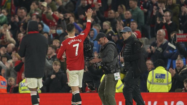 Para pemain MU kemudian mengelilingi lapangan setelah laga tuntas untuk memberikan penghormatan kepada para suporter. Ronaldo menjadi salah satu pemain yang mendapatkan banyak sorotan kamera.