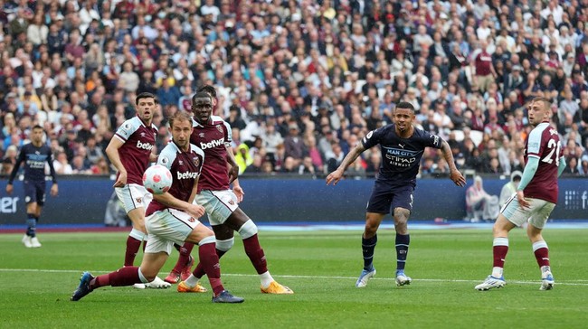 Duel West Ham vs Man City digelar di Stadion London, Minggu (15/5/2022) malam WIB. The Citizens kepayahan usai tertinggal dua gol lebih dulu di babak pertama usai kemasukan sepasang gol Jarrod Bowen.