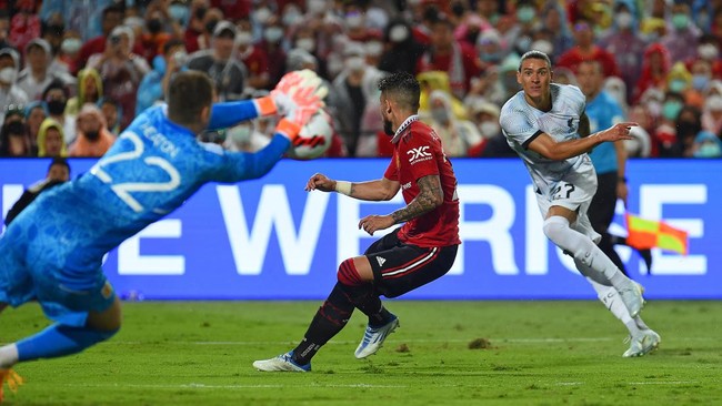 Liverpool kalah 0-4 saat menghadapi Manchester United di Stadion Rajamangala, Bangkok, Selasa (12/7/2022) malam WIB, dalam laga uji coba pramusim. Empat gol di gawang 'Si Merah' itu dicetak oleh Jadon Sancho, Fred, Anthony Martial, dan Facundo Pellistri.