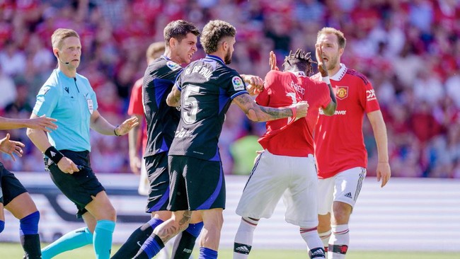 Tensi panas mewarnai laga uji coba Manchester United kontra Atletico Madrid. Ada Scott McTominay yang memantik keributan, hingga Fred menginjak Alvaro Morata.