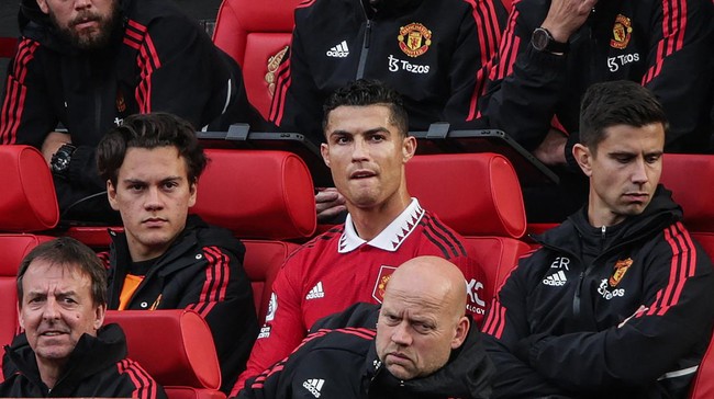 Sorotan mengarah kepada Ronaldo setelah duduk di bangku cadangan MU. Pemain terbaik dunia lima kali itu tampak masam, dan menggelengkan kepalanya beberapa kali.