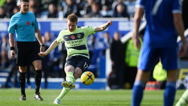 Manchester City meraih kemenangan tipis 1-0 di markas Leicester City. Gol tendangan bebas ciamik dari Kevin de Bruyne jadi satu-satunya pembeda.