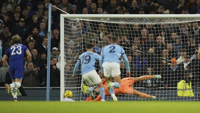 Kepa Arrizabalaga sempat mengganggu Julian Alvarez saat hendak menendang penalti. Kiper Chelsea itu malah berakhir dibobol penyerang Manchester City.
