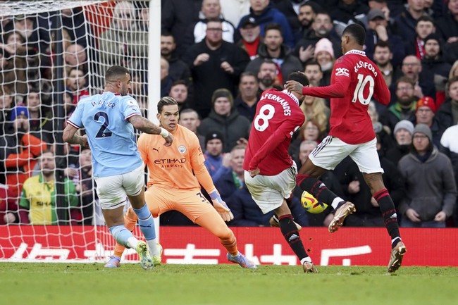 Umpan terobosan Casemiro mengarah kepada Marcus Rashford yang berlari menuju kotak penalti, namun penyerang 25 tahun itu tak mengambilnya karena berada di posisi offside. Dari belakang, Fernandes hadir memberi bantuan.