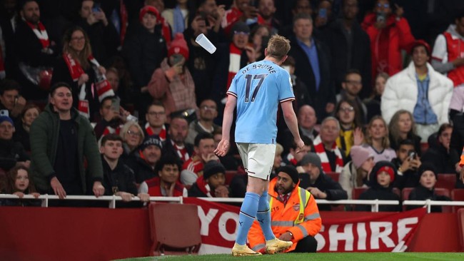 Untungnya akurasi lemparan buruk, sehingga tak ada yang mengenai De Bruyne. Suporter Arsenal tampaknya terpancing dengan gestur yang ditunjukkan pemain asal Belgia tersebut saat berjalan di depan mereka.