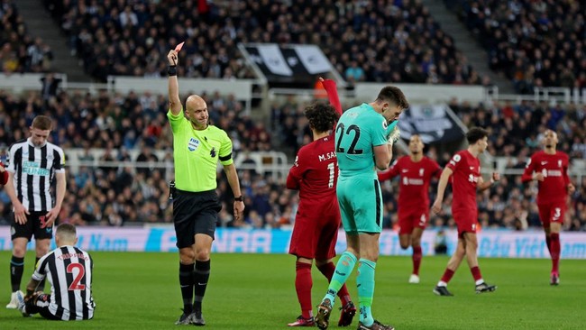 KARTU MERAH! Newcastle terpaksa bermain dengan sepuluh pemain tiga menit berselang. Kiper The Magpies, Nick Pope, diusir wasit gegara menangkap bola di luar kotak penalti dalam upayanya membendung Salah.