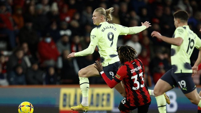 Manchester City menang telak 4-1 di markas Bournemouth, Minggu (26/2/2023) dini hari WIB pada lanjutan Premier League. Juara bertahan tampil dominan dan unggul empat gol lebih dulu lewat Julian Alvarez, Erling Haaland, Phil Foden, dan gol bunuh diri Chris Mepham.