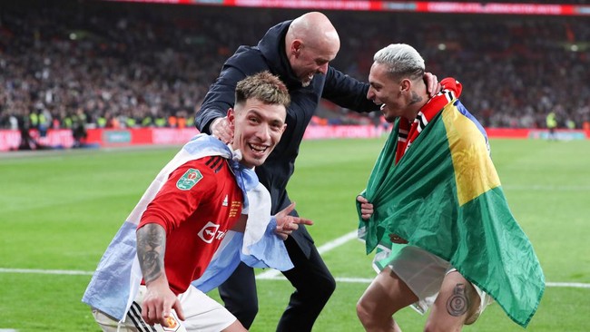 Usai pertandingan, terlihat manajer Erik ten Hag begitu berbahagia. Ia menari-nari di lapangan bersama Antony dan Lisandro Martinez.