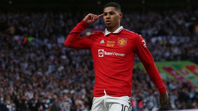 Rashford jadi starter pada laga Final Carabao Cup 2022/2023 di Wembley, Minggu (26/2/2023) malam WIB. Manchester United jadi juara usai menang 2-0.